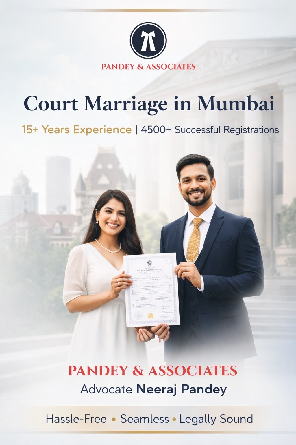 Pandey & Associates is one of the most trusted and best court marriage in Mumbai, with 15+ years of experience and 6500+ marriages registered. We offer quick, reliable, and hassle-free court marriage registration in Mumbai & Palghar , including same-day, Tatkal Marriage, and priority options, eliminating the standard 30-day waiting period. Our services are inclusive and legally sound for all — inter-caste, inter-faith, NRI Marriages, and more under the Special Marriage Act, 1954. Located in Khar East, near Bandra & Santacruz, our office ensures efficient handling of all documentation and three-witness arrangements. If you’re searching for the best court marriage in Mumbai, Pandey & Associates is your most dependable partner."