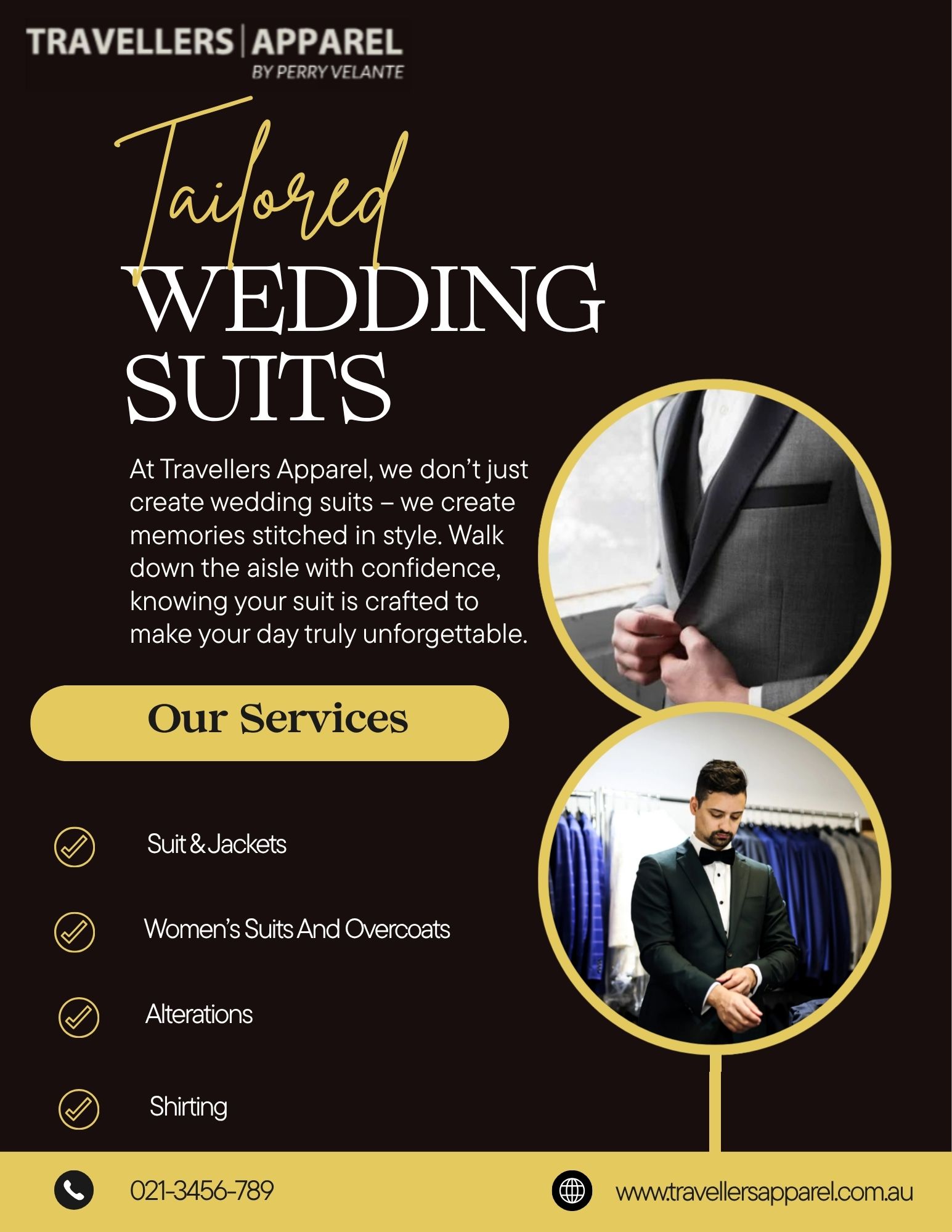 Craft a narrative of style and sophistication with Travellers Apparel by Perry Valente. As a master Bespoke Tailor, we are dedicated to the art of creating impeccably tailored garments that reflect your unique personality. From classic business suits to elegant casual wear, every piece is a testament to our precision, passion, and commitment to quality. We offer a full range of services, including meticulous repairs and alterations, ensuring your wardrobe is perfectly attuned to your personal style. Experience the difference of a garment made exclusively for you, where every stitch is a story."